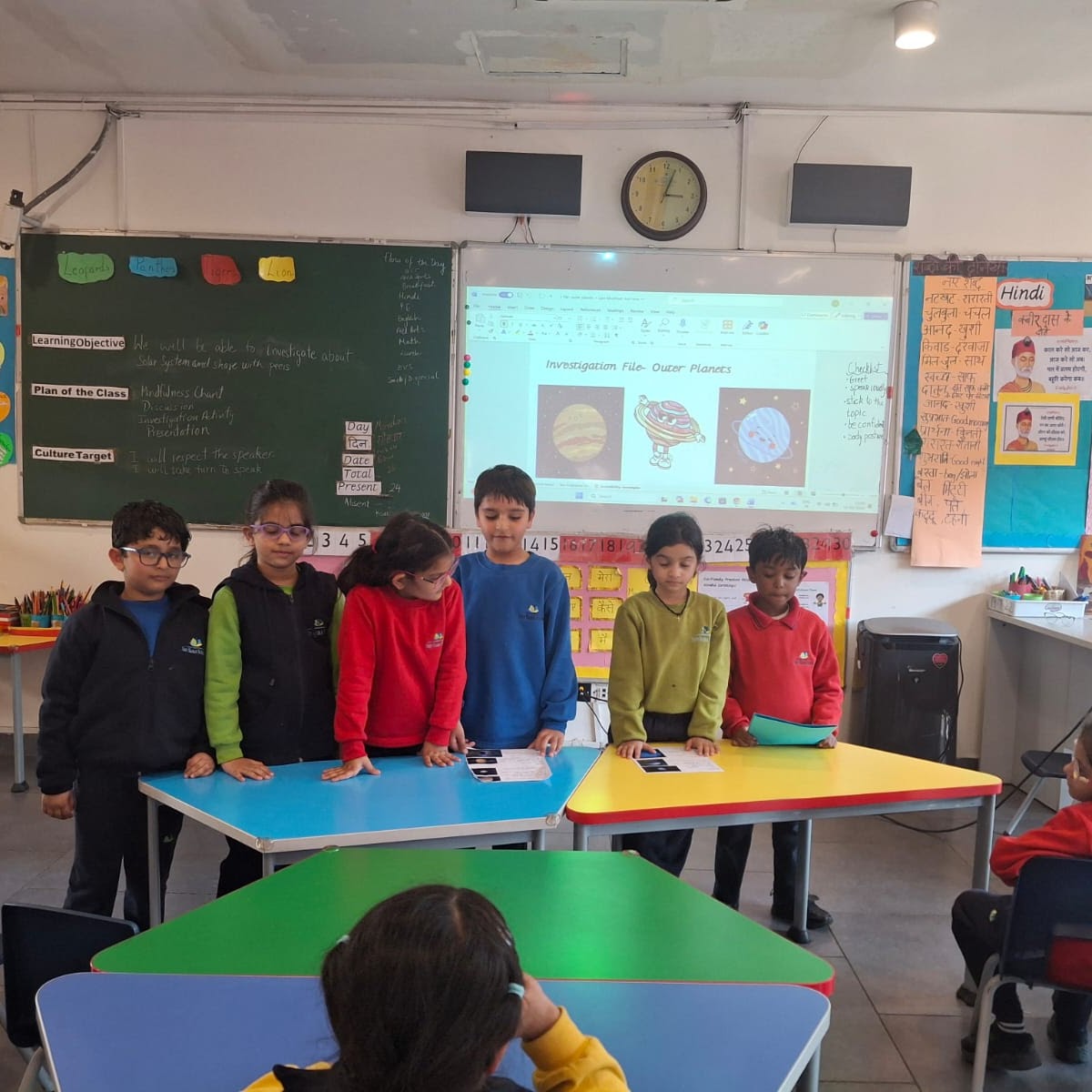 As part of their learning, learners explored the inner and outer planets, stars, moons and satellites, asteroids, and comets through structured investigation files. Working in groups, they shared their findings with the class and engaged in interactive discussions, confidently asking questions and exchanging ideas.