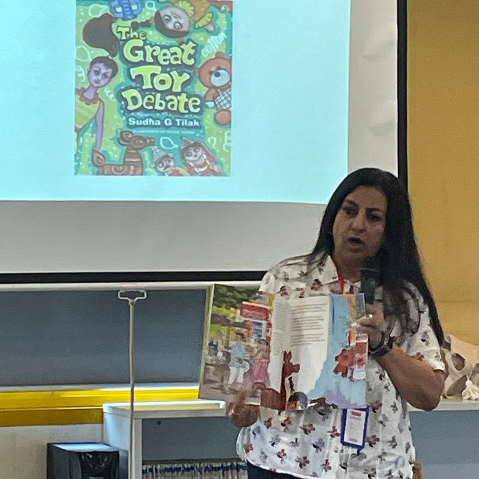 Our Kindergarten learners were privileged to attend an engaging storytelling session with renowned author Ms. Sudha G. Tilak, who introduced her latest book, The Great Toy Debate. Through expressive narration, Ms. Tilak brought to life characters and stories that celebrate toys from across India, igniting young imaginations.