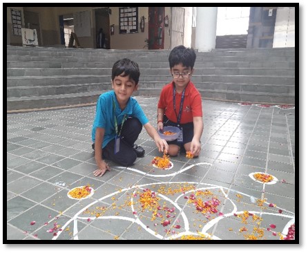 To make our children aware of this famous festival of Kerala, there was a Homeroom discussion on Onam. With an aim to enhance their aesthetic sense and fine motor skills, Early Years children decorated the ‘Pookalam’ (flower rangoli) in the Circle of Love and outside their Homerooms.