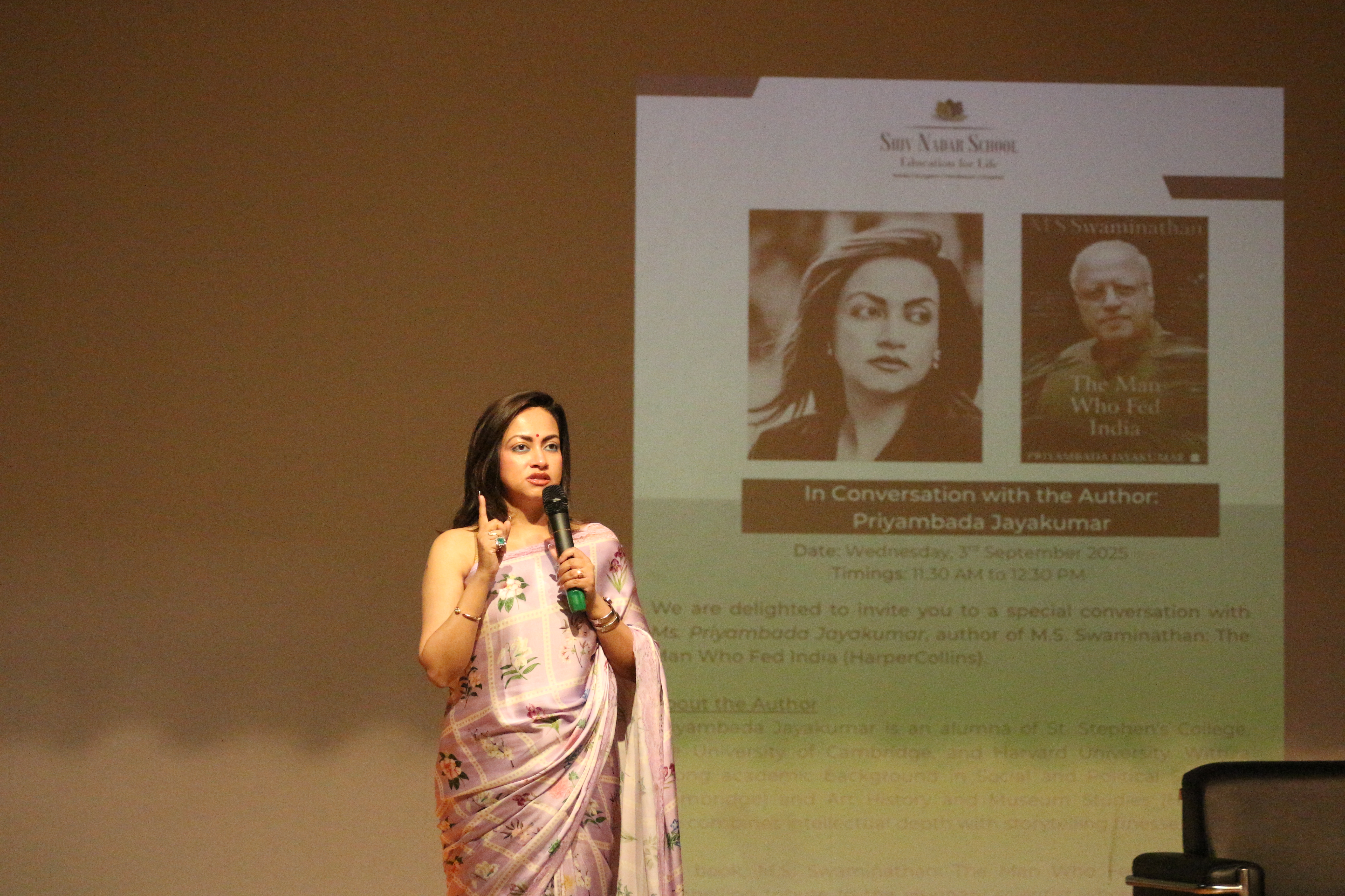 On 3rd September 2025, Shiv Nadar School, Faridabad hosted an engaging session with author Priyambada Jayakumar, who shared insights from her acclaimed book M.S. Swaminathan: The Man Who Fed India.