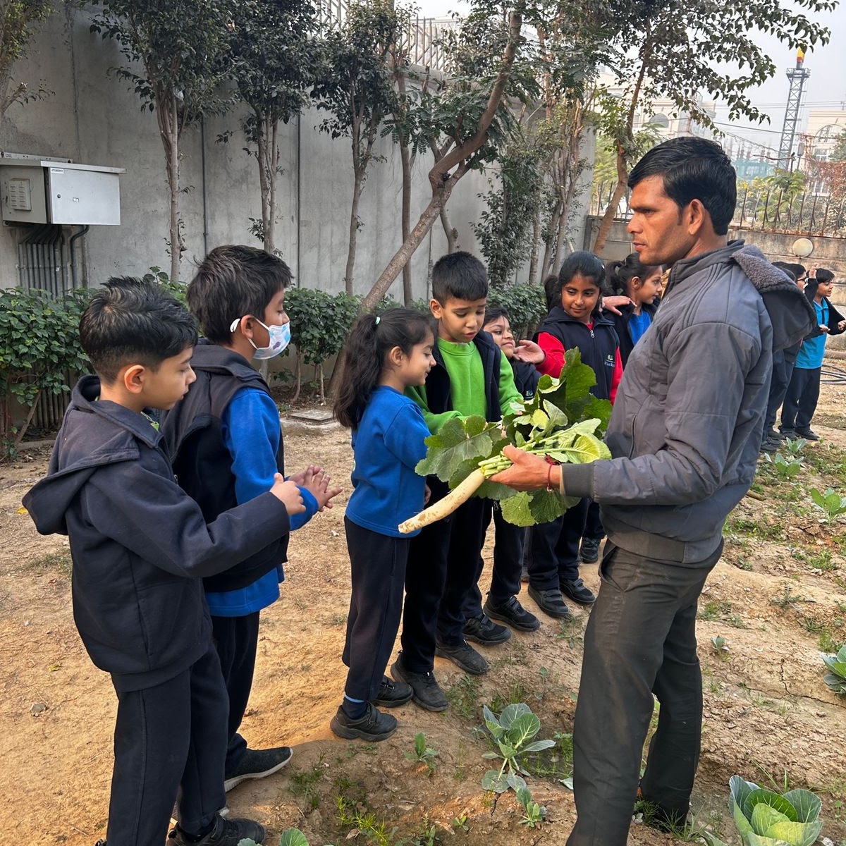 During the visit, learners enthusiastically harvested winter vegetables and observed how different vegetables grow and are harvested in unique ways. They explored and collected produce such as radish, turnip, brinjal, and coriander, engaging all their senses in the learning process.