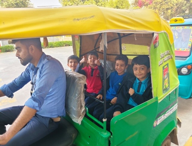 Following the ride, an interactive discussion session was conducted in the classroom. During this session, students eagerly shared their observations. They talked about the number of wheels each vehicle had, how many people can travel in them, and the kind of distances each vehicle can cover and so on. The students pointed out how the tractor is strong and used for heavy work, EV was quiet and smooth and the three-wheeler sparked curiosity due to its unique shape and number of wheels.