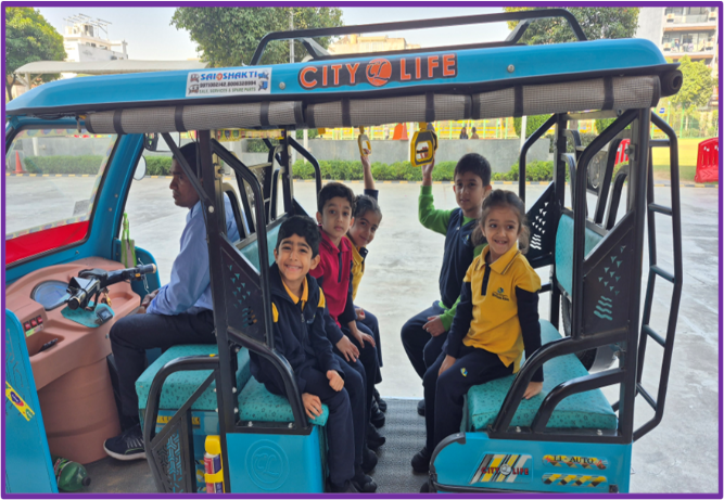 Under the theme “I Love Transport,” our Nursery students participated in a fun-filled and educational vehicle ride activity planned to give them real-life exposure to different modes of transport. The young learners had the exciting opportunity to explore and experience three types of vehicles: an electric vehicle (EV), a tractor, and a three-wheeler.