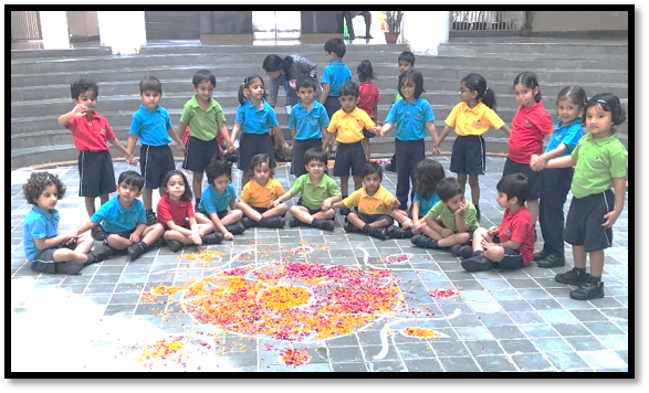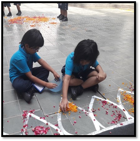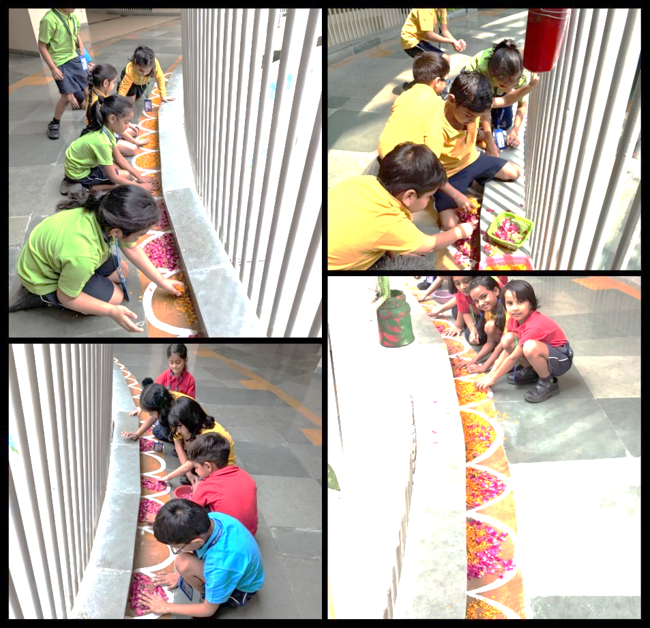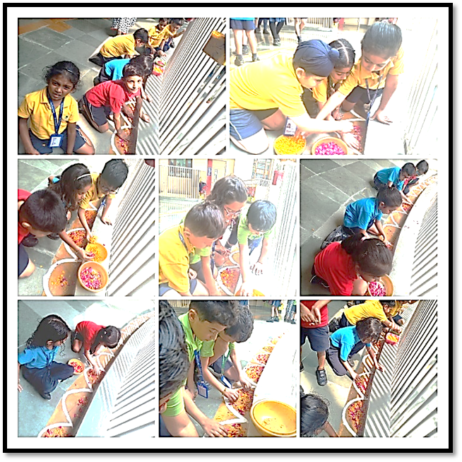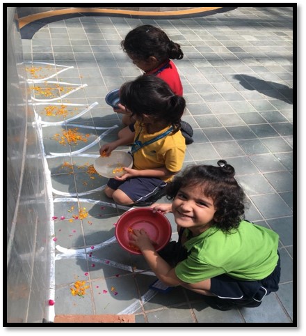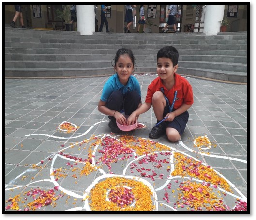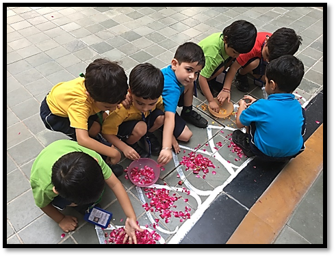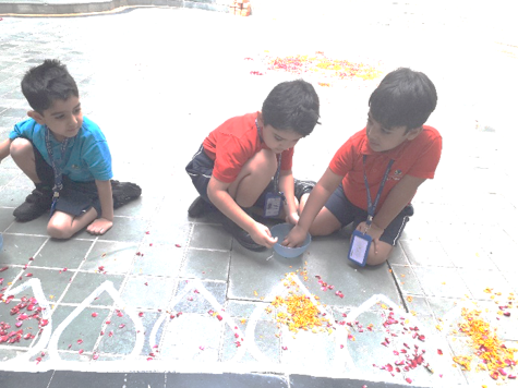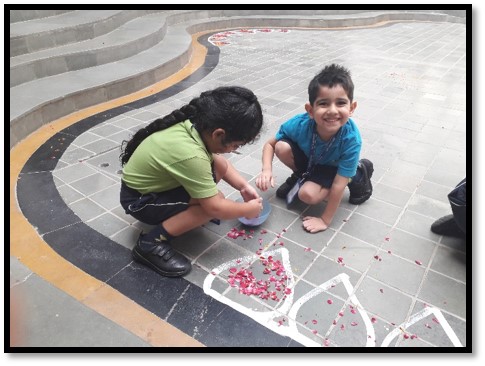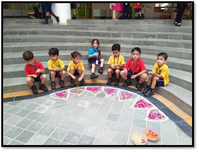 To make our children aware of this famous festival of Kerala, there was a Homeroom discussion on Onam. With an aim to enhance their aesthetic sense and fine motor skills, Early Years children decorated the ‘Pookalam’ (flower rangoli) in the Circle of Love and outside their Homerooms.